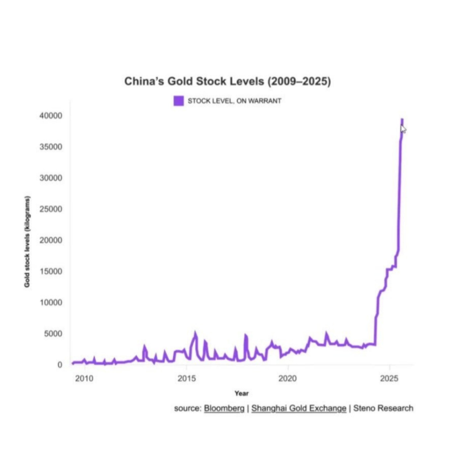 中国の金在庫推移を示すこの図は、2010年代から2023年頃まではほぼゼロに近い水平線で推移し、2014〜2016年に数千キログラム規模の短期的な増減が見られます。しかし2024年以降、曲線は急角度で上昇し、2025年には4万キログラムを超える金が上海の金取引所倉庫に登録されるという前代未聞の規模に達しています。グラフで扱っている「オンワラント在庫」は、先物取引の受け渡しに使える現物金を倉庫に預け入れると発行されるワラント(預かり証)付きの在庫を指し、実際に先物ポジションの決済や現物需要に使われる金保有量を示します。