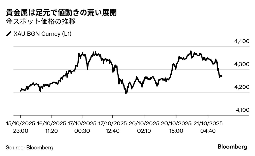図:2025年10月15日~21日の金スポット価格推移(ドル建て)。20日に約4380ドルの史上最高値に達した後、21日に急落した様子が示されている。