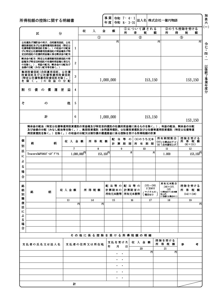 - 計算期間:分配金が支払われた実績はないため、主に解約時に計算期間が関係します。解約の収益分配金は購入日(元本設定日)から解約日までの期間とされます。例えば、2023年1月10日に購入し2025年3月20日に解約した場合、この期間が別表6(1)に記載する計算期間となります。