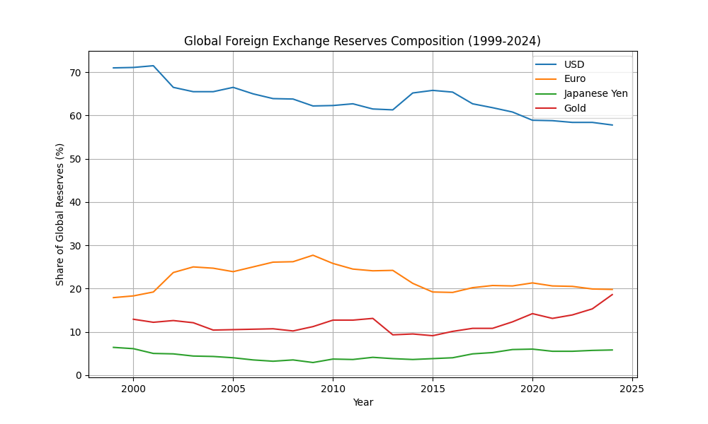 要約:1999年以降の外貨準備構成を弁証法的に見ると、米ドルの強力な支配(テーゼ)に対し、ユーロ導入や金融危機によるドル依存への疑念が現れ(アンチテーゼ)、結果としてドルのシェアが徐々に低下し、金の比率が急増するなど緩やかな多極化が進んでいる(総合)。それでもドルは過半のシェアを維持し、ユーロ・金・円は補完的な役割にとどまっている。