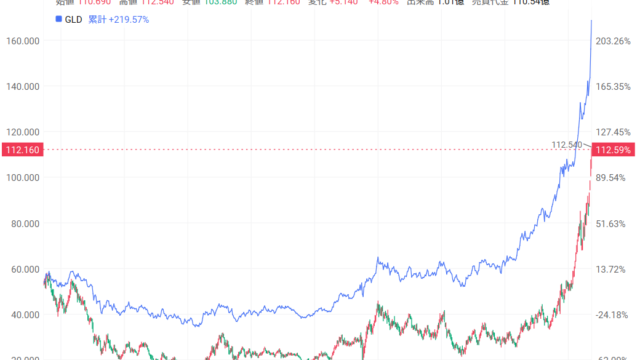 背景添付されたチャートは、金地金に連動するETF GLD(青線)と金鉱株ETF GDX(赤いローソク足)の長期パフォーマンスを示しています。2013年以降、GDXはGLDに比べて低迷が続きましたが、2024年後半から急騰し、2025年にはG...