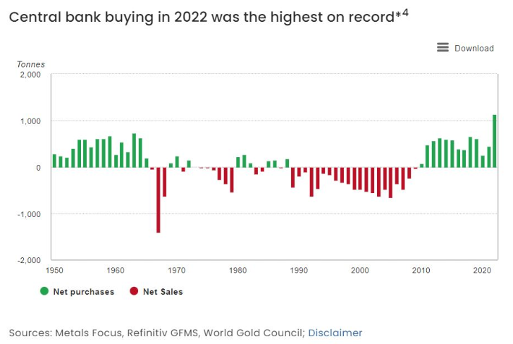 中央銀行による金の純購入量(緑)と純売却量(赤)の推移(1950–2022年)。2022年は記録的な純購入となった。このグラフから、1990年代の欧州勢による大量売却(赤)と、近年の新興国中心の大量購入(緑)への転換が読み取れる。