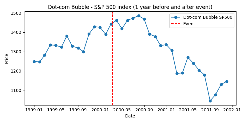 - S&P500: 1999年初頭から急速に上昇し、2000年春にピークを迎えました。その後はバブル崩壊により急落し、2001年後半には1100ポイント付近まで下落しました。