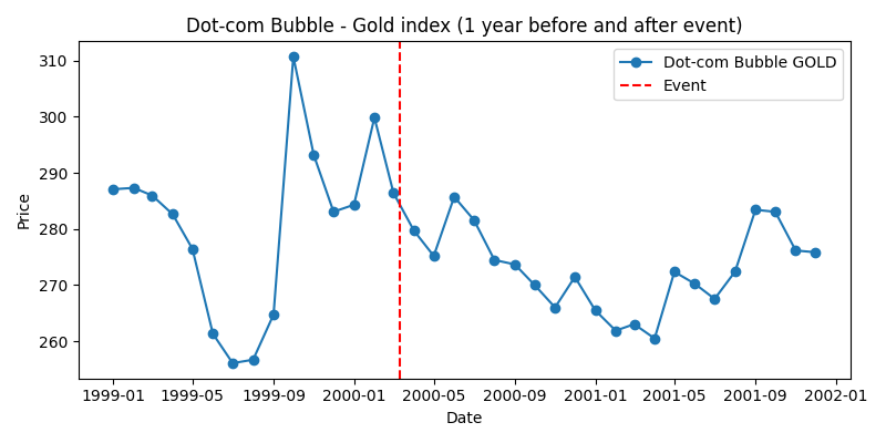 - 金価格: バブル期には株式への資金流入により低迷し、1999〜2000年は260〜280ドル台で推移しました。崩壊後は不透明感が高まり、2001年末にはやや反発しました。