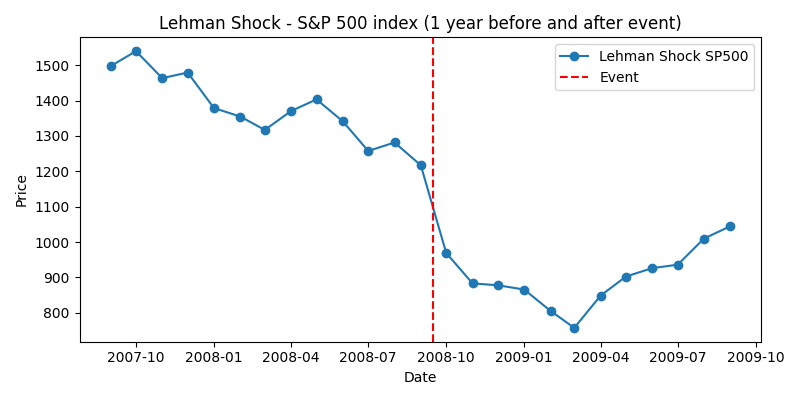- S&P500: 2007年後半まで堅調でしたが、リーマン破綻の前後で急落し、2009年3月には700ポイント台まで下落しました。その後、各国政府や中央銀行による大規模な支援策を受けて回復しました。