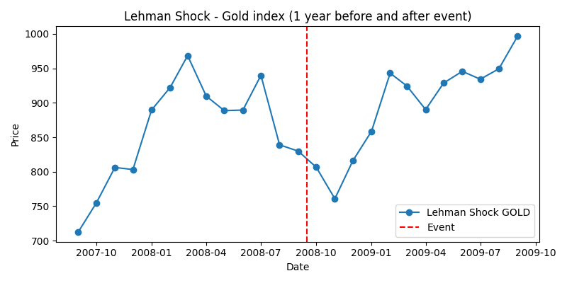 - 金価格: 安全資産としての需要から2007年後半から上昇傾向にありました。リーマン破綻直後は一時的に下げたものの、その後は再び上昇し、2009年には約1000ドルに達しました。