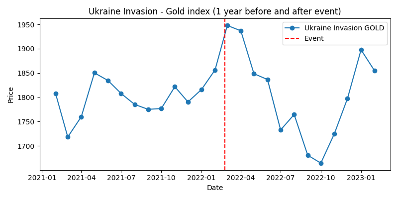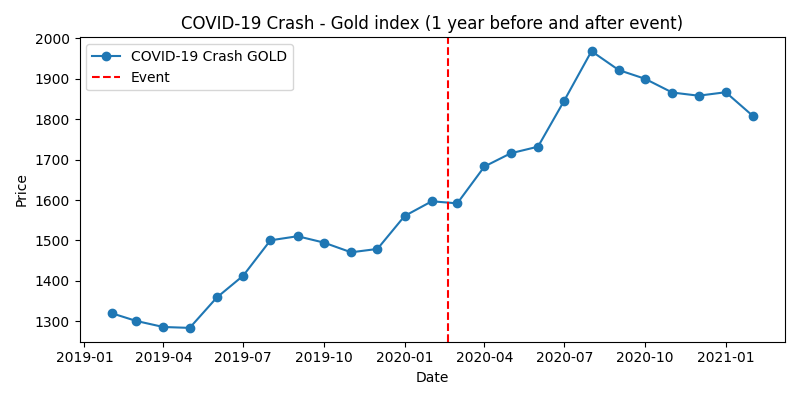 これで、各ショックとその前後1年間の株価指数および金価格の動きをひとつの回答としてまとめました。