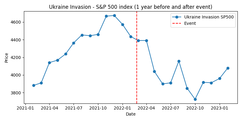 - S&P500: 2021年は好調でしたが、インフレや金融引き締め懸念で2022年初めに下落し、侵攻を受けてさらに売りが強まりました。2022年10月には3700ポイント台まで下落しましたが、その後2023年初には4000ポイント台に回復しました。