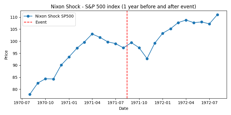 - S&P500: 1970年後半には反発の兆しがあり、ニクソン・ショック直前まで緩やかな上昇が続きました。ショック直後は一時的に下落しましたが、その後は上昇に転じ、1972年には再び高値を更新しました。