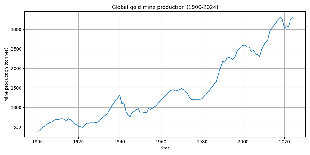 金の鉱山生産量は、米国地質調査所(USGS)の年次報告や各国地質調査機関のデータを集約したデータセットによれば、1900年の386 tから2018年には3 310 tへと約8.6倍に増加し、長期的には一貫して拡大してきました。下のグラフは1900–2024年の世界の金鉱山生産量(精錬前、金含有量換算)を示しています。