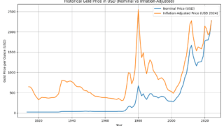 投資 ドル建て金価格の長期推移(名目値 vs 実質値) 図は1700年代~現代の金価格推移を示しています。青線がドル建ての名目金価格、オレンジ線が米国CPIでインフレ調整した実質金価格です。米国は1834年に1オンス $20.67 で金価格を固定し(1933年まで維持)、その後1934年に固定価... 2025.09.18 投資